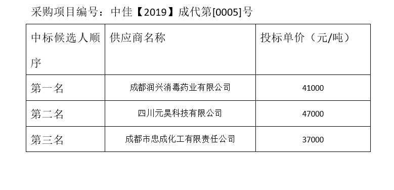 內(nèi)江市污水處理有限責(zé)任公司碳源補(bǔ)充劑和輔助消毒劑招標(biāo)項目(第2包)評標(biāo)結(jié)果公示