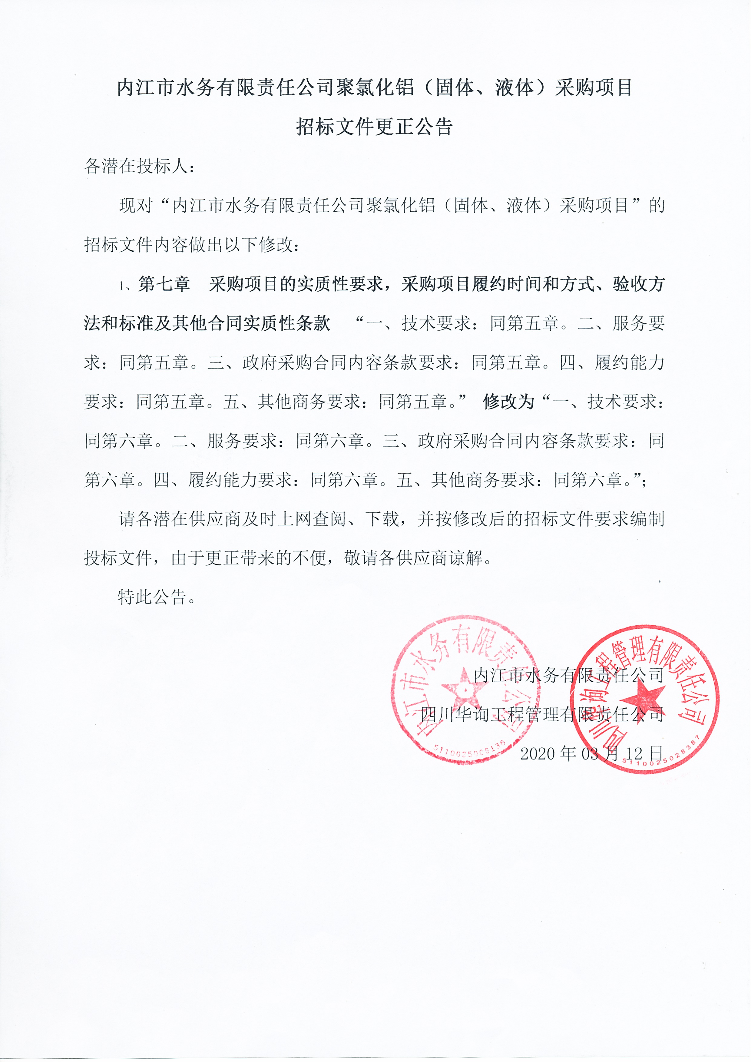 內(nèi)江市水務(wù)有限責(zé)任公司聚氯化鋁(固體、液體)采購項(xiàng)目招標(biāo)文件更正公告
