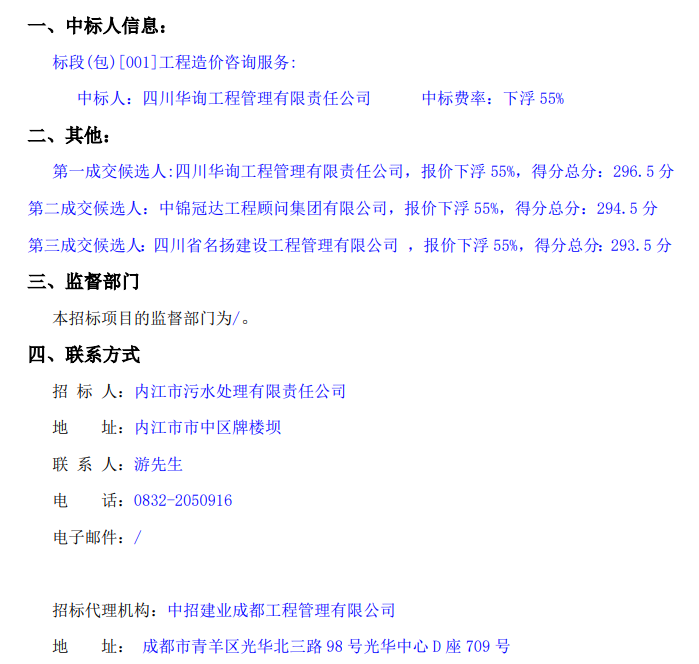 內(nèi)江市第二污水處理廠二期工程造價(jià)咨詢(xún)服務(wù)項(xiàng)目中標(biāo)結(jié)果公示