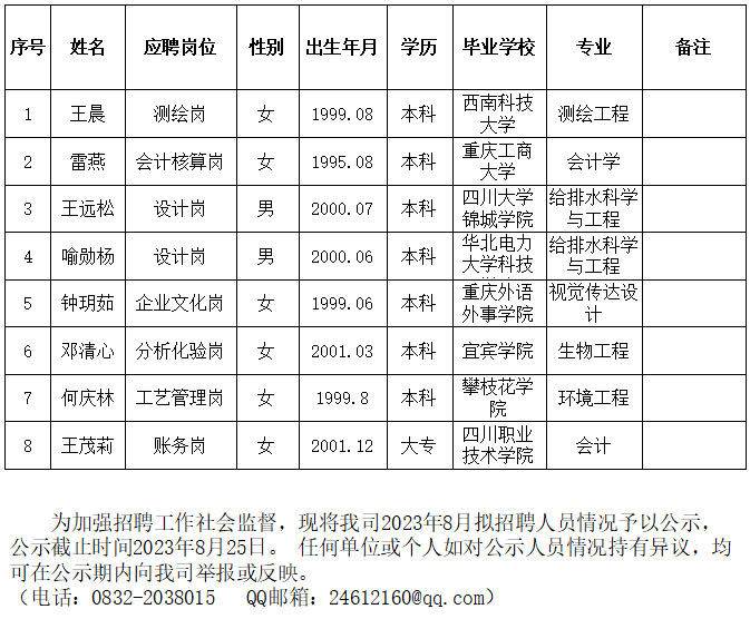 內(nèi)江市水務(wù)有限責(zé)任公司2023年8月擬招聘人員公示