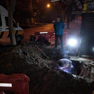 2月2日晚8點(diǎn)40分,接到市民報(bào)漏電話,位于晏家灣車站外的供水主管爆裂,部門立即組織人員趕往現(xiàn)場(chǎng)。經(jīng)查看確認(rèn)為一根DN150供水主管破裂,為了保障居民的正常用水,搶修人員連夜冒雨對(duì)供水管道進(jìn)行搶修,經(jīng)過(guò)5個(gè)小時(shí)的搶險(xiǎn)作業(yè),于次日凌晨1點(diǎn)完成搶修任務(wù),保障了該區(qū)域居民正常用水。