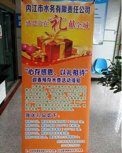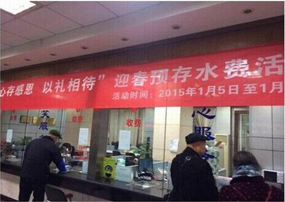 為感謝廣大用戶對(duì)城市供排水事業(yè)的長(zhǎng)期支持和幫助,我司在2015年1月5日至1月24日期間開(kāi)展“心存感恩、以禮相待”迎春預(yù)存水費(fèi)活動(dòng)。本次活動(dòng)由客戶服務(wù)部牽頭,在白馬辦事處、物資供應(yīng)部和機(jī)關(guān)各部門(mén)的支持配合下,圓滿結(jié)束。
