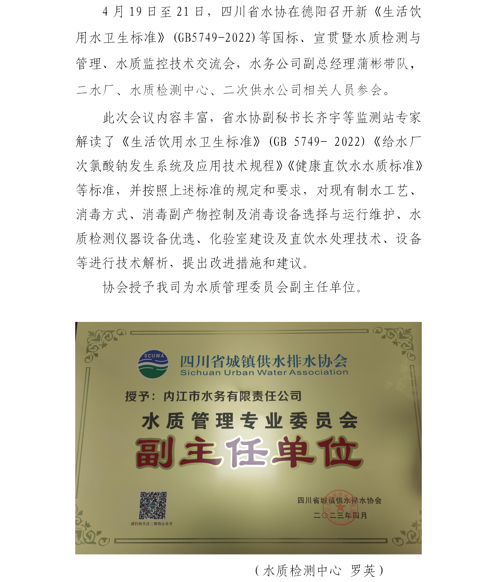 內(nèi)江市水務(wù)公司獲省水協(xié)授予水質(zhì)管理專業(yè)委員會(huì)副主任單位