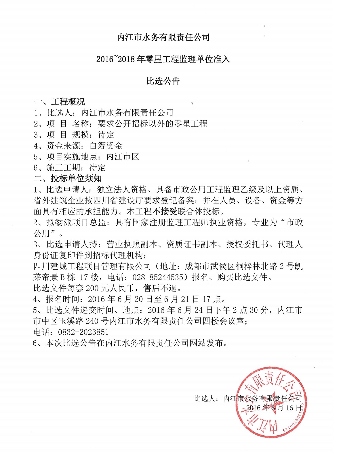 內(nèi)江市水務有限責任公司2016~2018年零星工程監(jiān)理單位準入比選公告