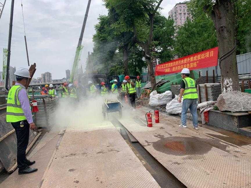 本次演練以上游及本市突降特大暴雨、沱江河水位猛漲、并倒灌鋼板樁圍堰內(nèi)、水位持續(xù)上升、嚴(yán)重威脅現(xiàn)場(chǎng)施工安全為背景。演練過(guò)程中,現(xiàn)場(chǎng)作業(yè)人員及搶險(xiǎn)救援人員聽從項(xiàng)目經(jīng)理指揮,協(xié)同配合,現(xiàn)場(chǎng)人員有序撤離,并立即啟動(dòng)排水泵,緊急調(diào)用潛水泵進(jìn)行增援,對(duì)圍堰內(nèi)積水進(jìn)行抽排。
