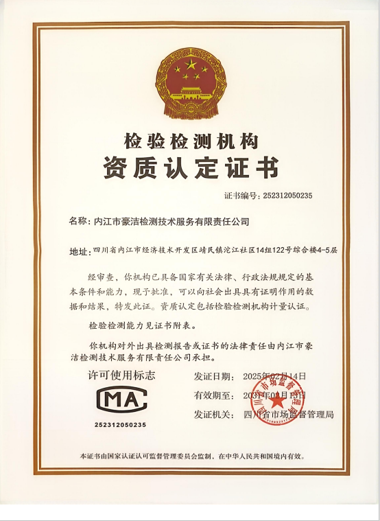 經(jīng)四川省市場監(jiān)督管理局批準(zhǔn),內(nèi)江市豪潔檢測技術(shù)服務(wù)有限責(zé)任公司正式取得《檢驗檢測機構(gòu)資質(zhì)認(rèn)定證書》,此項資質(zhì)的取得標(biāo)志著我司在檢驗檢測方面已達到了國家相關(guān)標(biāo)準(zhǔn)和要求,具備了向社會提供公正、準(zhǔn)確的檢測服務(wù)資質(zhì)和能力。