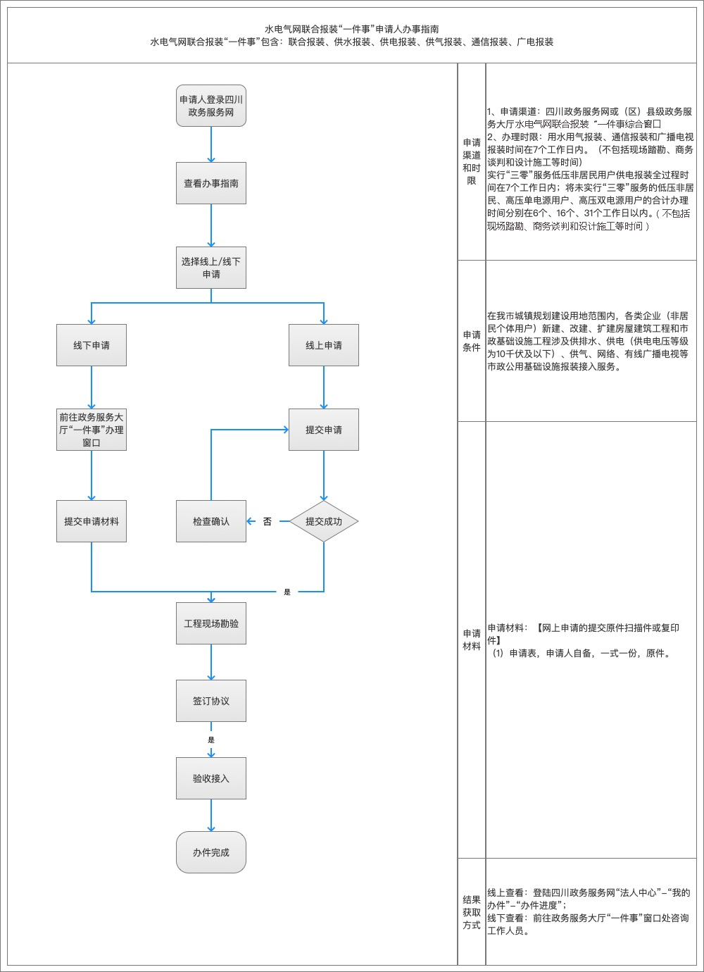 (一)網(wǎng)上申請:申請人登錄四川政務(wù)服務(wù)網(wǎng)平臺,點(diǎn)擊工程建設(shè)項(xiàng)目審批專欄,選擇具體報(bào)裝辦理事項(xiàng),提交申請,上傳申請材料。